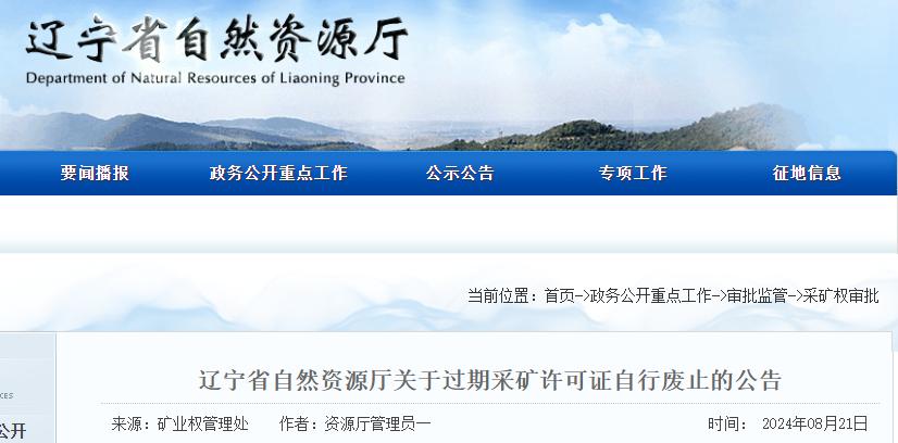 根據(jù)《礦產(chǎn)資源開采登記管理辦法》(國務(wù)院令第241號)和《自然資源部關(guān)于進一步完善礦產(chǎn)資源勘查開采登記管理的通知》(自然資規(guī)〔2023〕4號)等有關(guān)規(guī)定,經(jīng)核實,海城市旭益升菱鎂石采掘有限公司采礦許可證在有效期屆滿前未依法申請辦理延續(xù)登記手續(xù),采礦許可證自有效期屆滿之日起已經(jīng)自行廢止,現(xiàn)予以公告。
