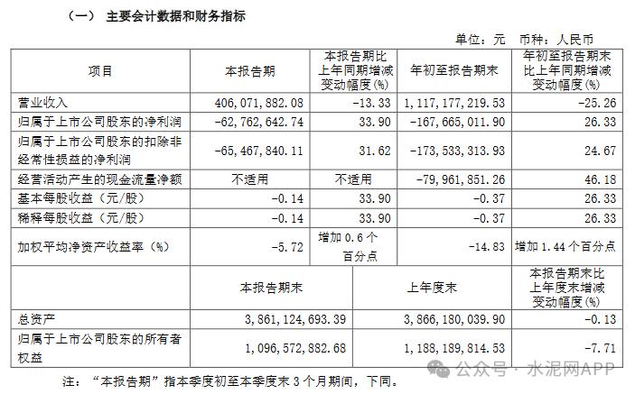 10月23日晚間,福建水泥披露2024年第三季度報告,報告期公司實現營收11.17億元,同比下降25.26%;歸母凈利潤虧損1.68億元,虧損同比縮小26.33%。