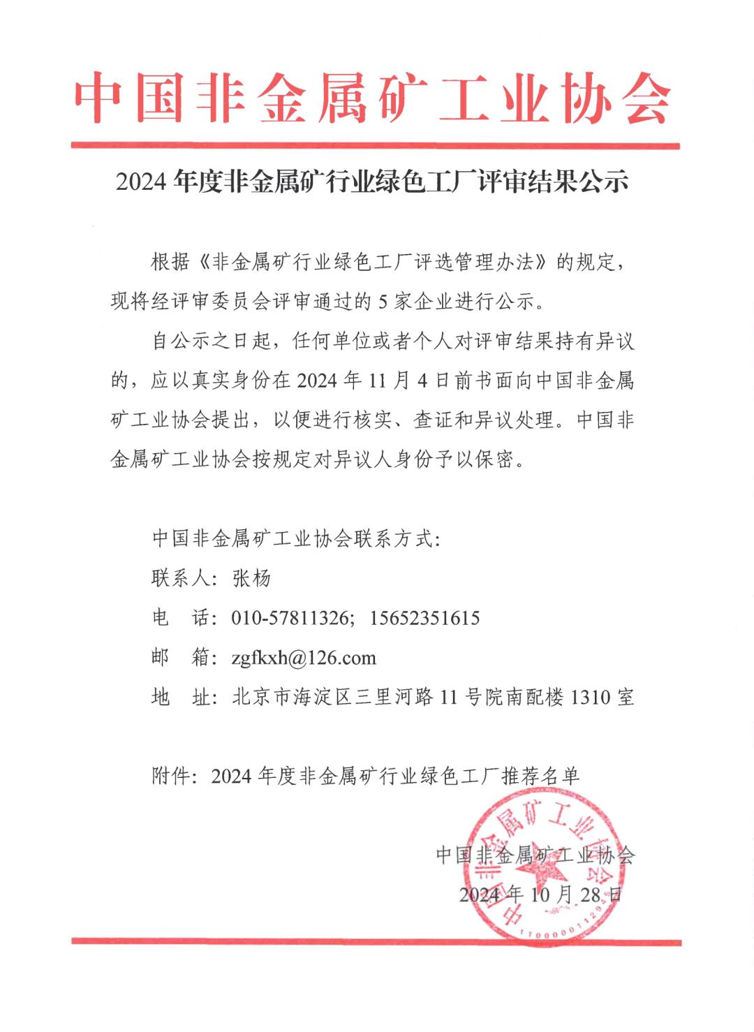 2024年度非金屬礦行業(yè)綠色工廠評審結(jié)果公示