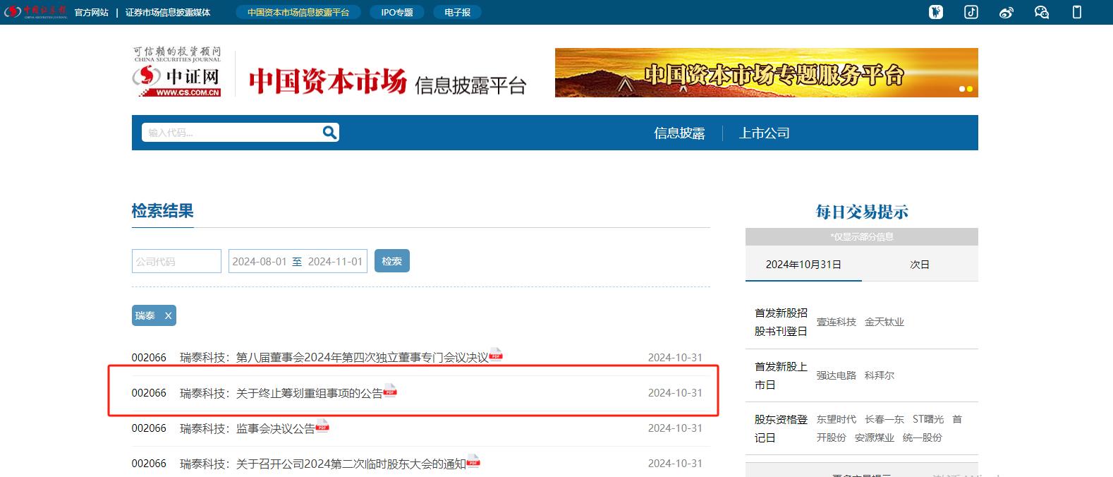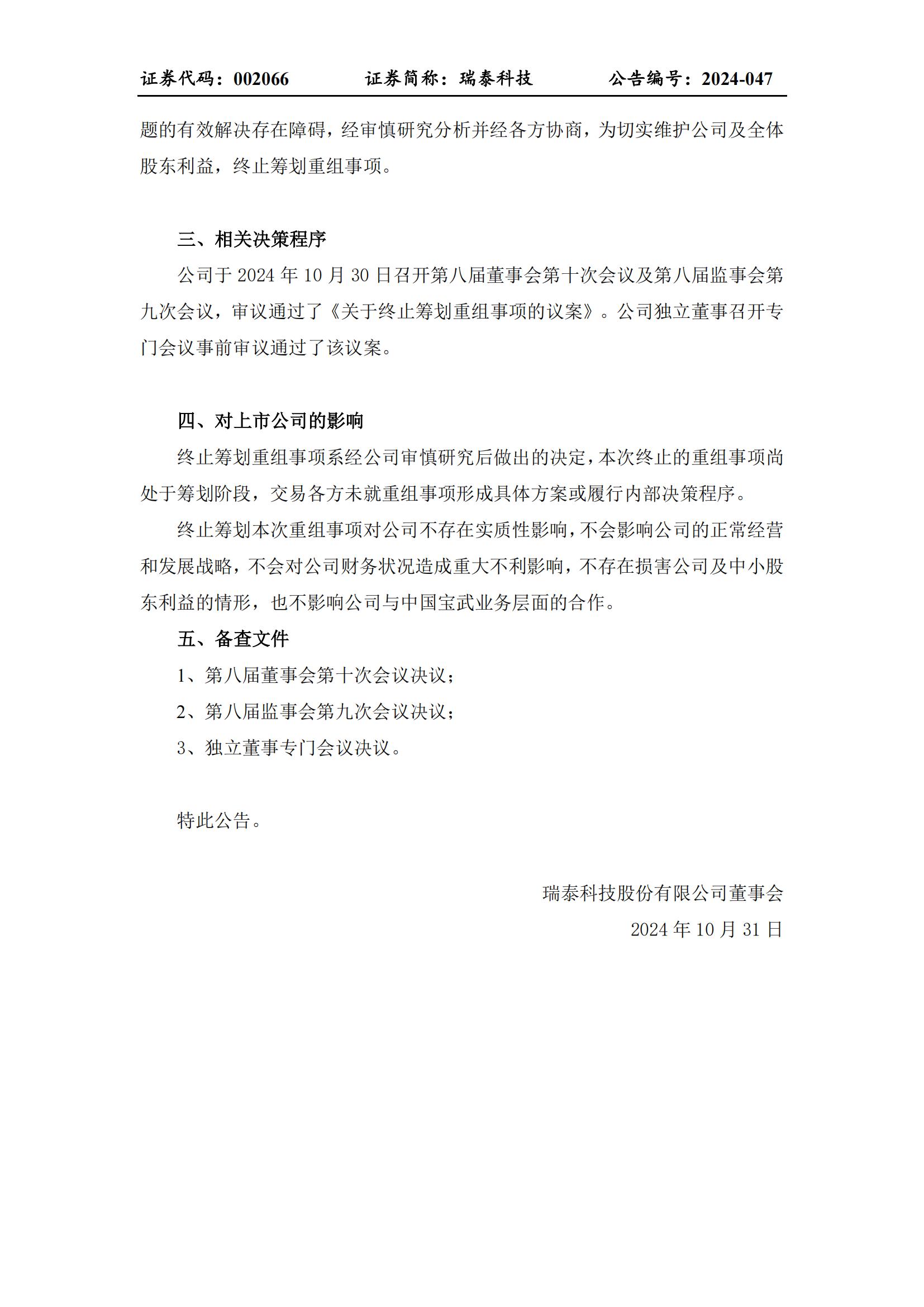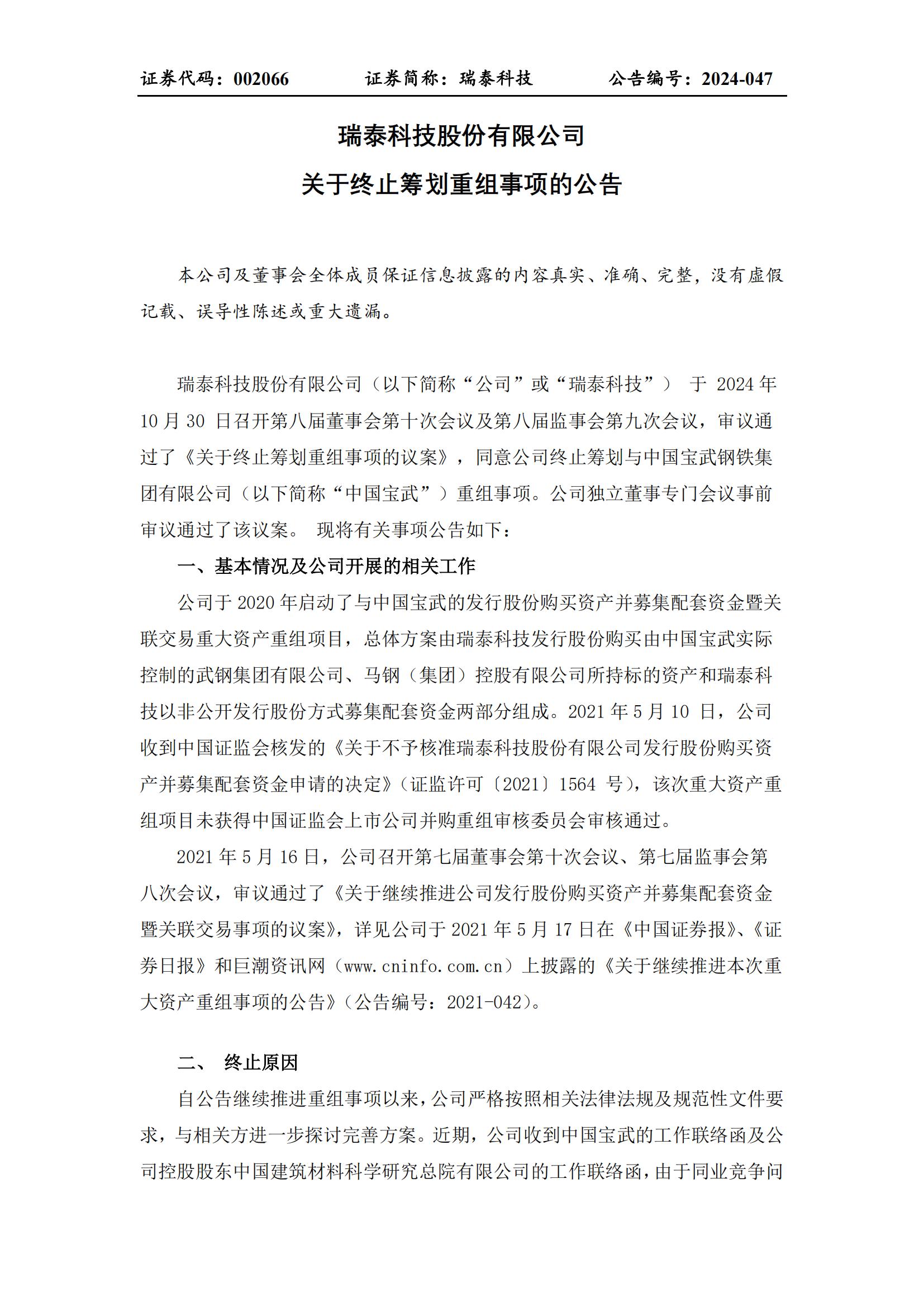 瑞泰科技10月30日晚公告,公司董事會審議通過了《關于終止籌劃重組事項的議案》,同意公司終止籌劃與中國寶武的重組事項。本公告同日刊登在《中國證券報》、《證券日報》和巨潮資訊網(www.cninfo.com.cn)上的《瑞泰科技股份有限公司關于終止籌劃重組事項的公告》(公告編號:2024-047)。