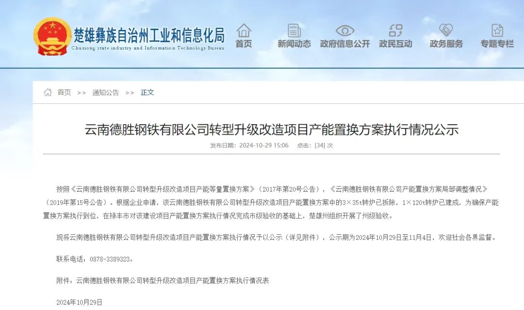 現將云南德勝鋼鐵有限公司轉型升級改造項目產能置換方案執行情況予以公示(詳見附件),公示期為2024年10月29日至11月4日,歡迎社會各界監督。