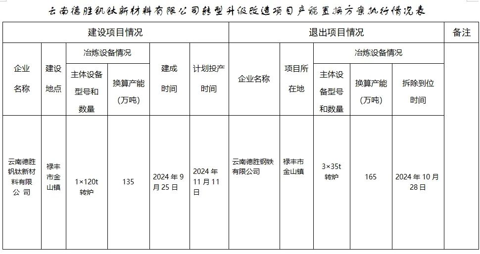 按照《云南德勝鋼鐵有限公司轉型升級改造項目產能等量置換方案》(2017年第20號公告),《云南德勝鋼鐵有限公司產能置換方案局部調整情況》(2019年第15號公告)。根據企業申請,該云南德勝鋼鐵有限公司轉型升級改造項目產能置換方案中的3×35t轉爐已拆除,1×120t轉爐已建成,為確保產能置換方案執行到位,在祿豐市對該建設項目產能置換方案執行情況完成市級驗收的基礎上,楚雄州組織開展了州級驗收。
