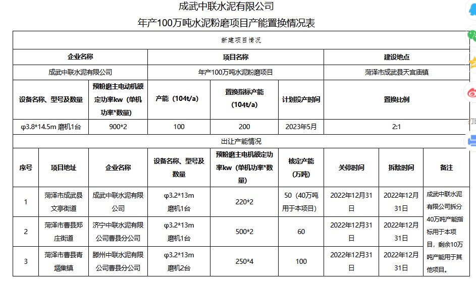 公告顯示,2022年10月19日公告的成武中聯水泥年產100萬噸產線產能置換項目,中聯集團決定不再實施。中聯集團擬將該方案中滕州中聯曹縣分公司100萬噸產能指標,調配用于魯南中聯新建年產130萬噸水泥粉磨項目。