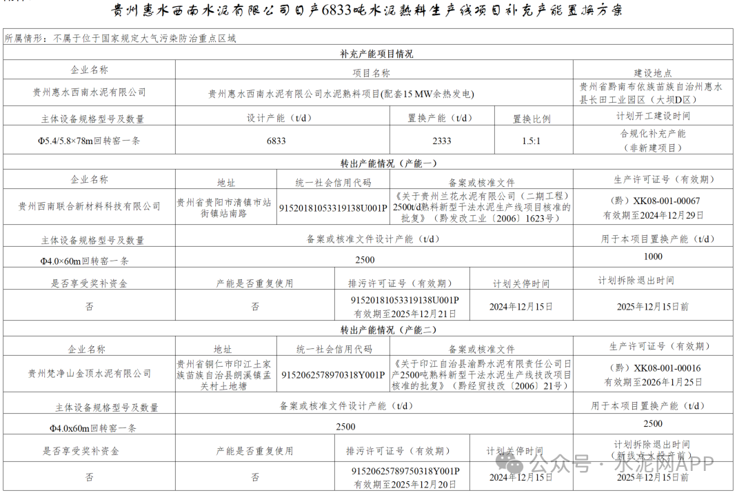 內容顯示,貴州惠水西南水泥水泥熟料項目(配套15 MW余熱發電)設計產能6833t/d,補充產能2333t/d,置換比例1.5∶1。