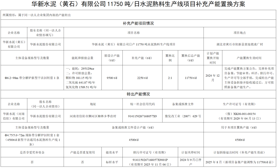 安徽荻港海螺水泥股份有限公司現有1條2000t/d水泥熟料生產線,由于其規模小、能耗高,擬將該產能置換到同一廠區內2條4500t/d水泥熟料生產線。方案顯示,荻港海螺水泥兩條4500t/d水泥熟料線產能調整為5500t/d,置換產能1000t/d,置換比例1∶1。退出一條2000t/d熟料線,公告之日起關停,履行國有資產處置程序后拆除。