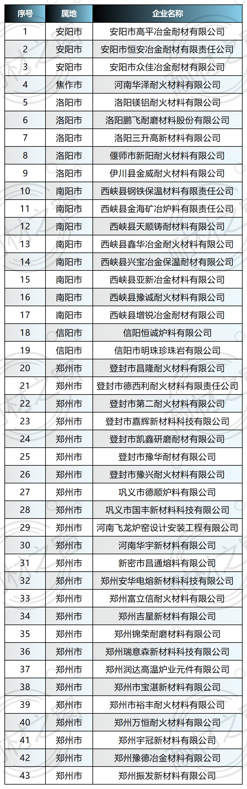 24年底,河南省工業和信息化廳對入選2024年度河南省創新型中小企業名單進行公示,根據《河南省優質中小企業梯度培育管理實施細則(暫行)》,優質中小企業由創新型中小企業、專精特新中小企業和專精特新“小巨人”企業三個層次組成。其中,創新型中小企業具有較高專業化水平、較強創新能力和發展潛力,是優質中小企業的基礎力量。經公告的創新型中小企業有效期為三年,每次到期后由企業重新登錄培育平臺進行自評,經省工業和信息化廳審核通過后,有效期延長三年。這次評選共計3839家企業入選,小編整理耐火材料相關企業共計43家 。(排名不分先后按照屬地統計)