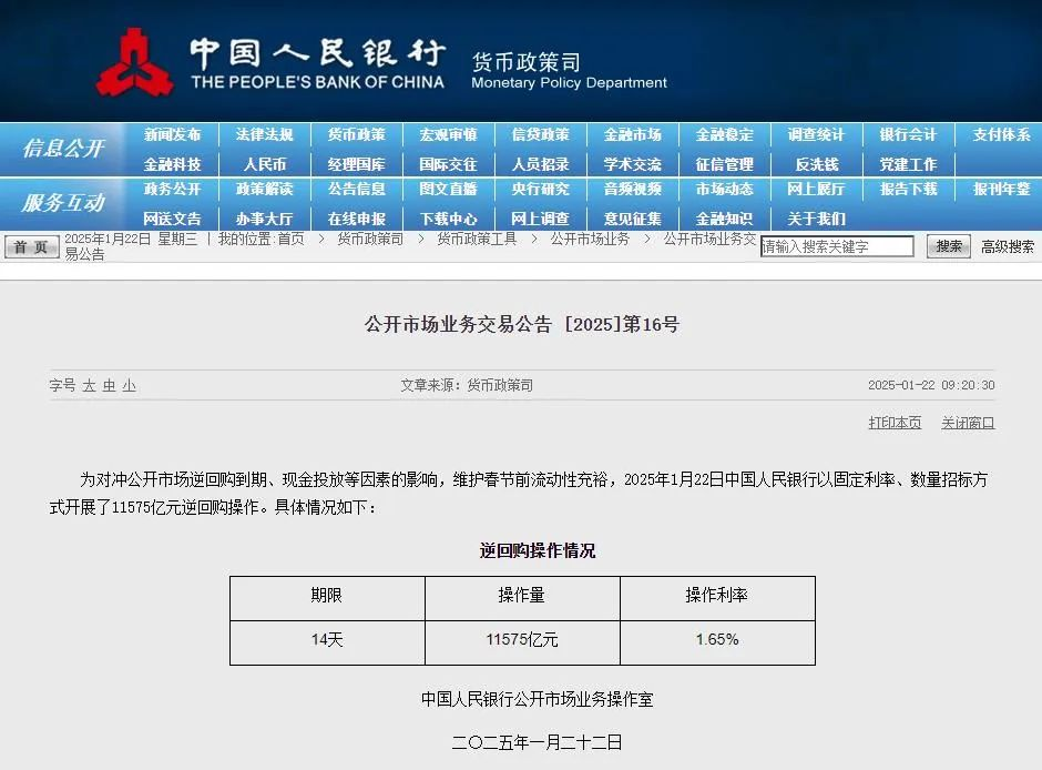 為對沖公開市場逆回購到期、現(xiàn)金投放等因素的影響,維護(hù)春節(jié)前流動性充裕,2025年1月22日中國人民銀行以固定利率、數(shù)量招標(biāo)方式開展了11575億元逆回購操作。