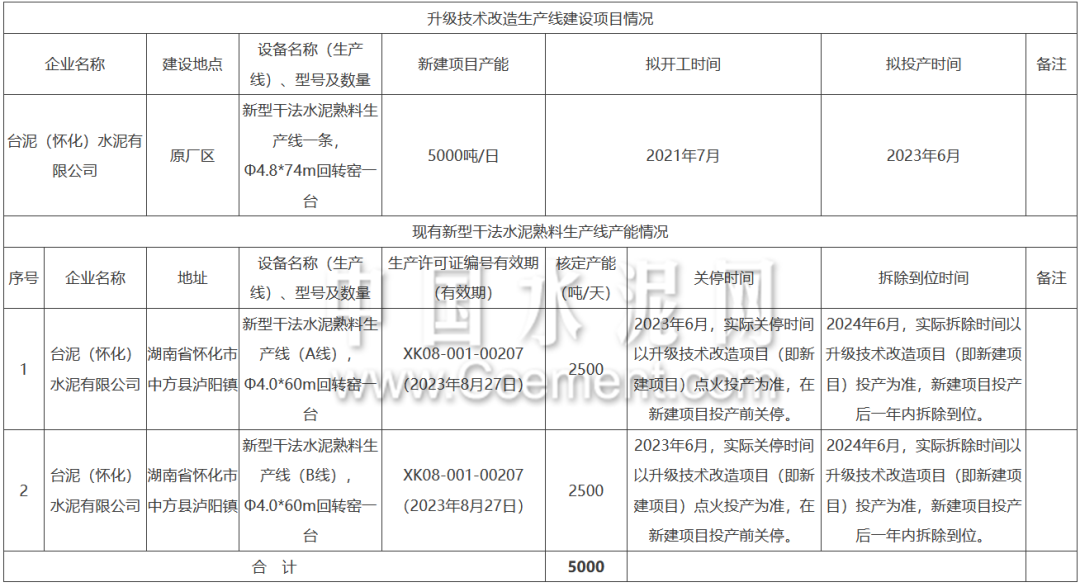公告稱,2021年5月21日,湖南省工信廳公告了臺泥(懷化)水泥有限公司日產5000噸新型干法水泥熟料回轉窯生產線升級技術改造項目基本情況,該公司擬在原廠區內實施智能化升級技術改造,將原有兩條生產線“合二為一”建設一條5000t/d新型干法水泥熟料生產線。