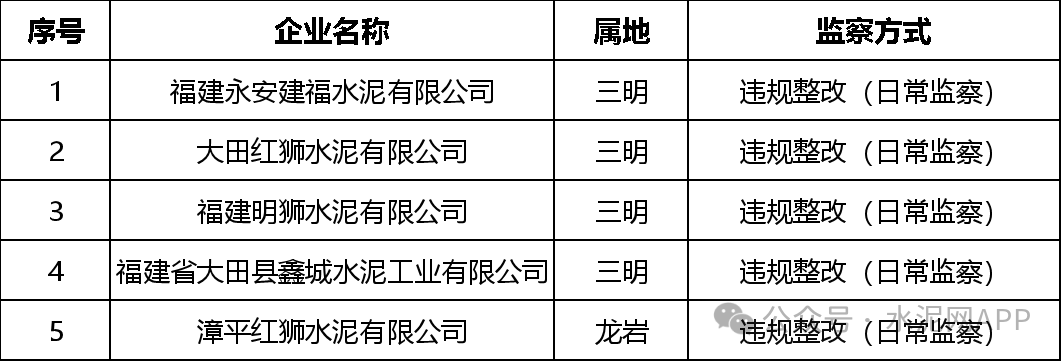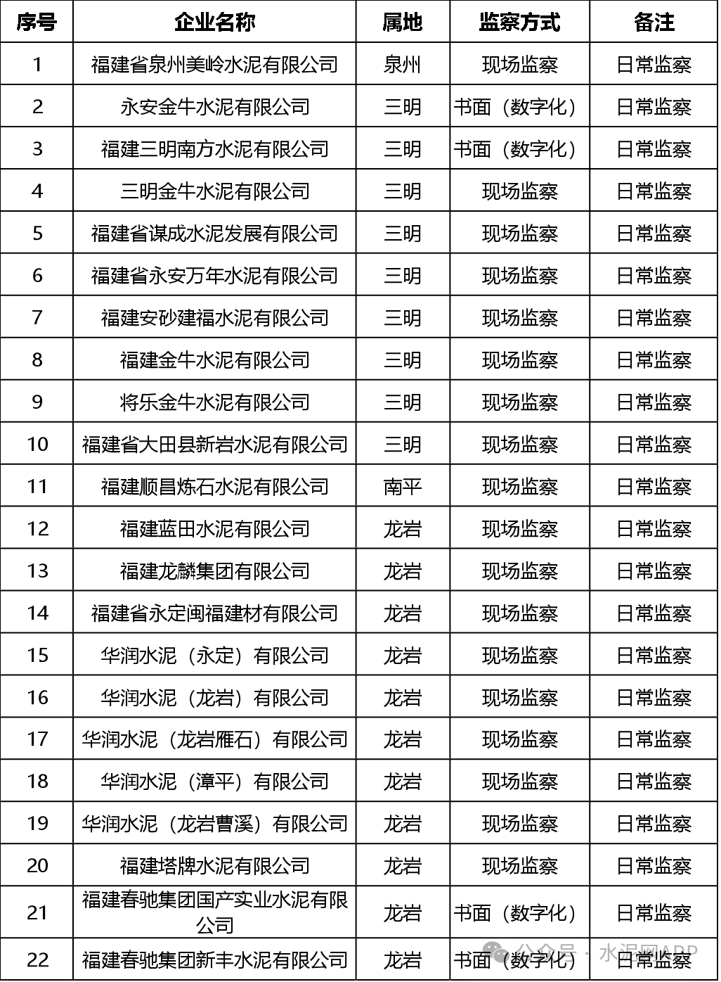 2025年福建省計劃開展重點用能企業工業節能監察318家,其中省級監察企業123家,市級監察企業195家,采取現場監察與書面(數字化)監察結合的方式開展。其中水泥企業監察名單整理如下: