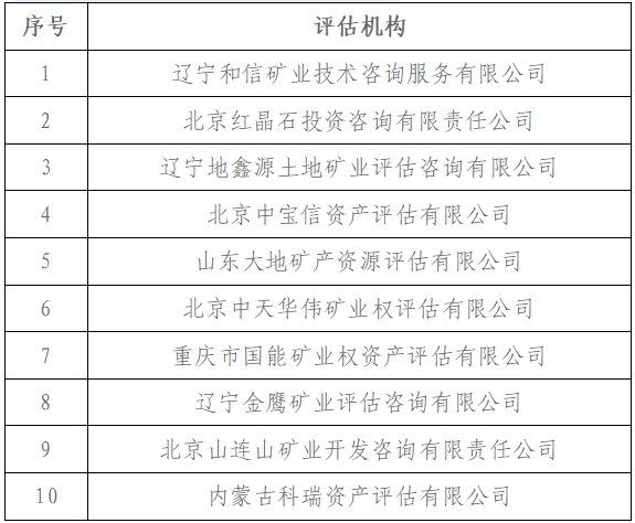 按照《遼寧省自然資源廳關(guān)于公開遴選礦業(yè)權(quán)出讓收益評估機構(gòu)的公告》要求,經(jīng)綜合評定,確定入圍機構(gòu)名單如下,特此公告。