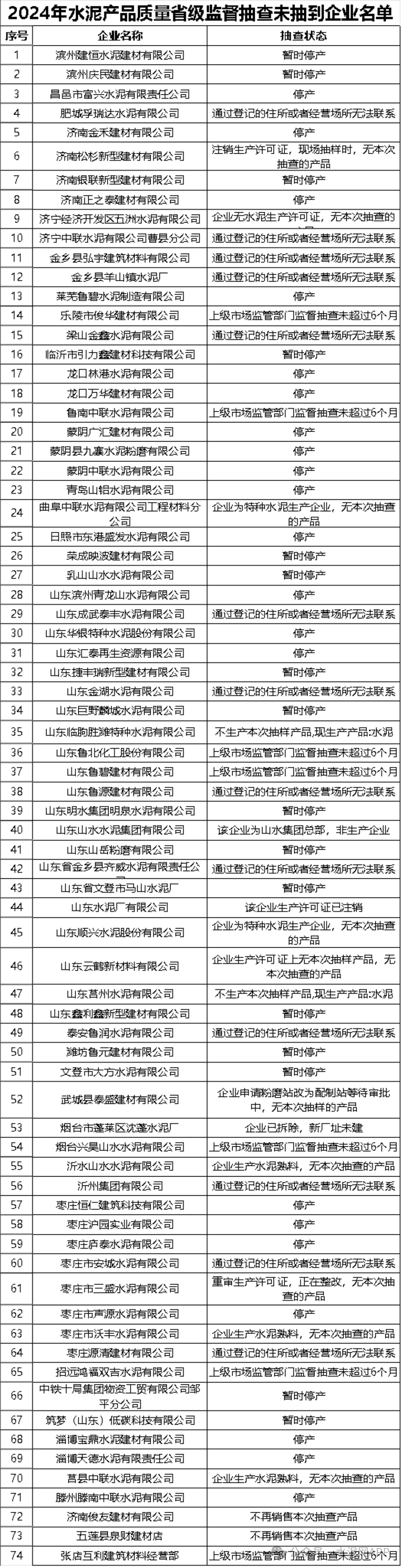 近日,山東省市場監管局發布2024年水泥產品質量省級監督抽查結果。經查,2批次水泥產品不合格,221批次水泥產品合格,74家企業未抽到。