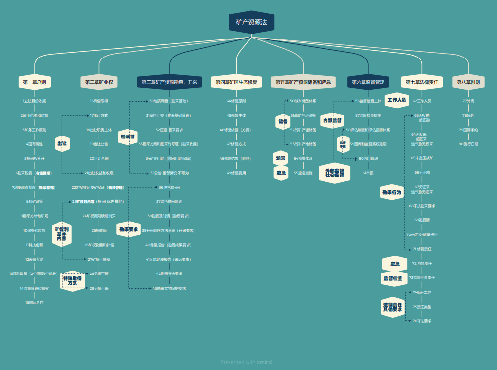 近日,廳政策法規處組織對新《礦產資源法》進行逐條研學,梳理形成了《新礦產資源法學習摘要》,以思維導圖形式呈現新礦法的脈絡和框架,便于礦業工作人員按圖索驥,高效掌握新《礦產資源法》的主要內容。下一步,遼寧省自然資源廳將通過廳網站、廳微信公眾號陸續開展條文內容研學,在全省自然資源系統掀起學習新礦法熱潮,為全省礦業高質量發展提供法治保障。