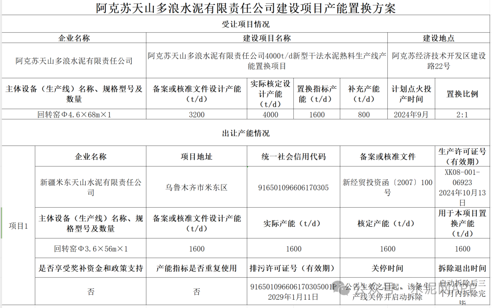 經現場核查確認,新疆米東天山水泥有限責任公司2024年8月置換至阿克蘇天山多浪有限責任公司的Φ3.6×56米(日產1600噸)水泥熟料生產線已關停拆除。