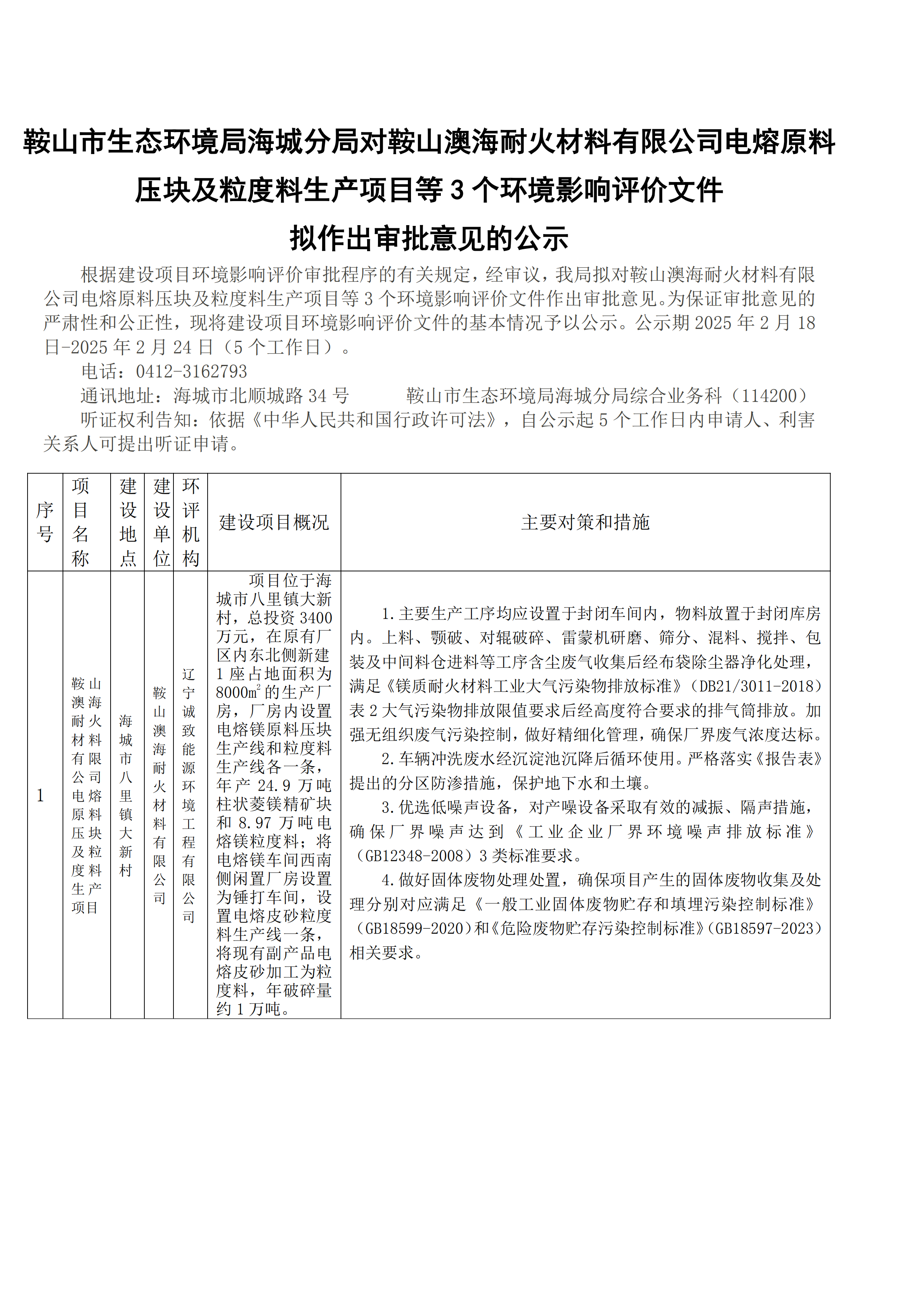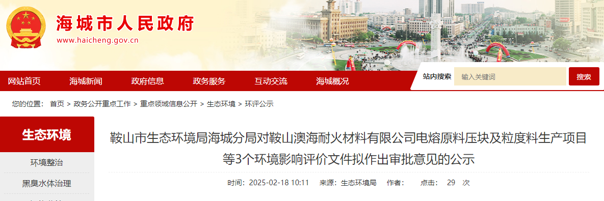 海城生態環境局對鞍山澳海耐火材料有限公司電熔原料壓塊及粒度料生產項目等3個環境影響評價文件擬作出審批意見的公示