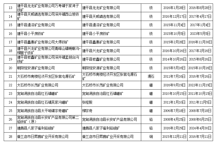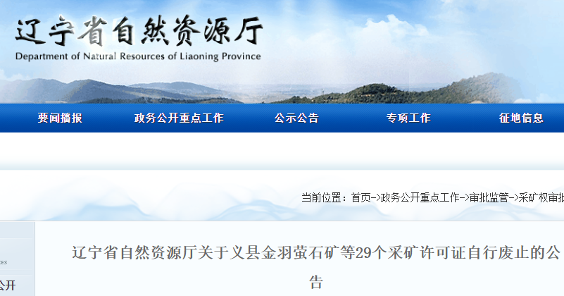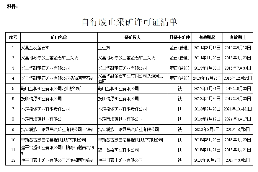 根據(jù)《礦產(chǎn)資源開采登記管理辦法》(國務(wù)院令第241號)第七條規(guī)定,采礦權(quán)人逾期不辦理延續(xù)登記手續(xù),義縣金羽螢石礦等29個(gè)采礦許可證自有效期屆滿之日起已自行廢止,現(xiàn)予以公告。