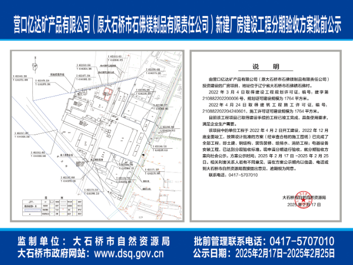 營口億達礦產品有限公司(原大石橋市石佛鎂制品有限責任公司)新建廠房建設工程分期驗收方案批前公示