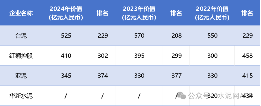 2月25日,胡潤研究院發布《2024胡潤中國500強》榜單,列出了中國500強非國有企業,按照企業價值進行排名。這是胡潤研究院連續第六次發布“胡潤中國500強”。 其中水泥行業:臺灣水泥排名第229位;紅獅控股排名第302位;亞洲水泥排名第374位。