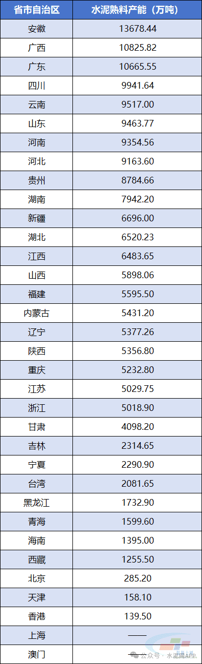 中國水泥網大數據顯示,截止到2024年底,全國共有已投產水泥熟料生產線1517條,合計熟料產能17.93億噸。 從地區分布來看,安徽、廣西、廣東三個省熟料產能均超過億噸,在全國排名前三,上海與澳門則沒有熟料產能布局。