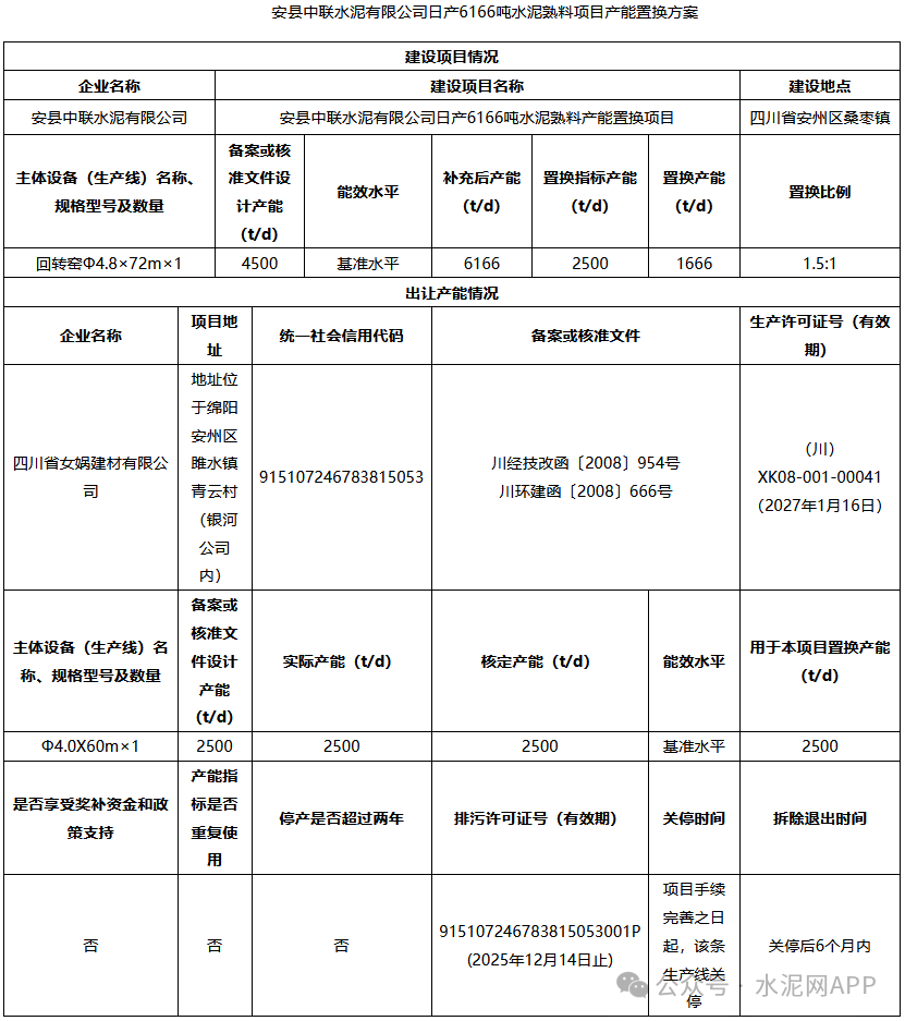 2月27日,四川省經(jīng)信廳發(fā)布“關(guān)于安縣中聯(lián)水泥有限公司水泥熟料項(xiàng)目產(chǎn)能置換方案的公示”。