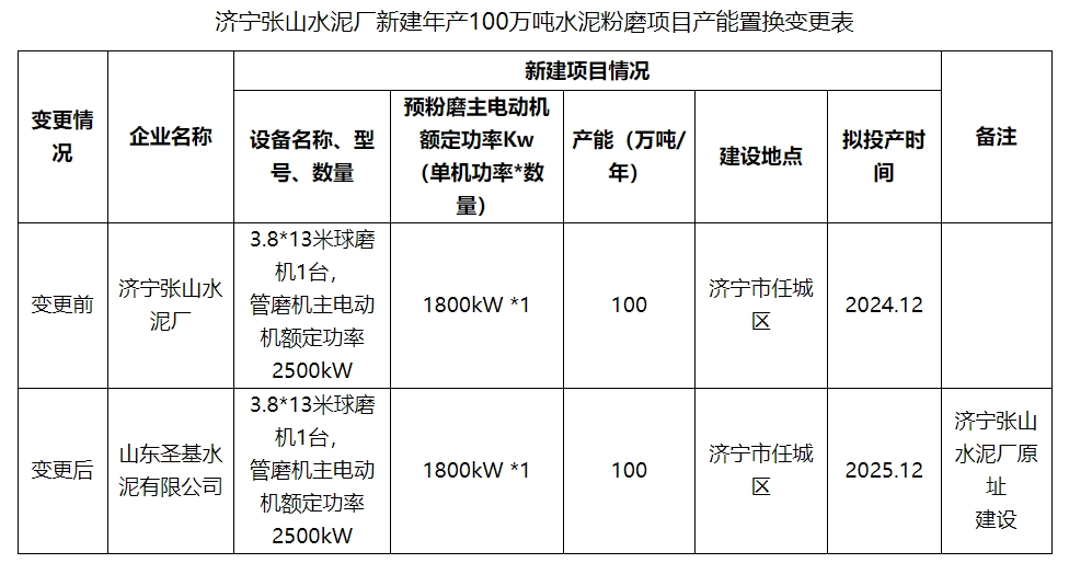 公告顯示,濟寧張山水泥廠新建年產100萬噸水泥粉磨項目擬變更產能置換實施主體為山東圣基水泥有限公司。