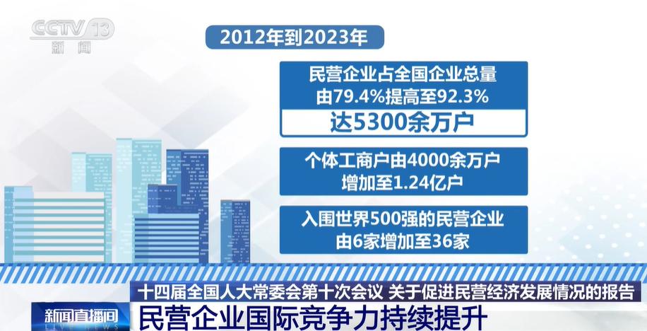 報告稱,民營經(jīng)濟規(guī)模實力持續(xù)提升,2012年到2023年,民營企業(yè)占全國企業(yè)總量由79.4%提高至92.3%,達5300余萬戶,個體工商戶由4000余萬戶增加至1.24億戶,入圍世界500強的民營企業(yè)由6家增加至36家;民營經(jīng)濟創(chuàng)新水平持續(xù)提升,2012年到2022年,國家高新技術(shù)企業(yè)中民營企業(yè)從2.8萬家增長至35.9萬家,占比由62.4%提升至90.9%。