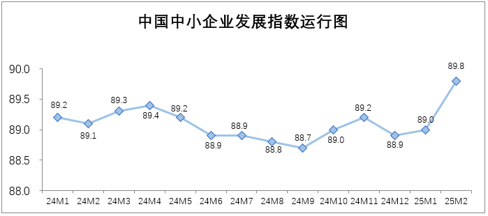 中國中小企業協會今日發布數據顯示,2月中小企業發展指數為89.8,較1月上升0.8點。其中,分項指數、分行業指數和分區域指數全面上漲。