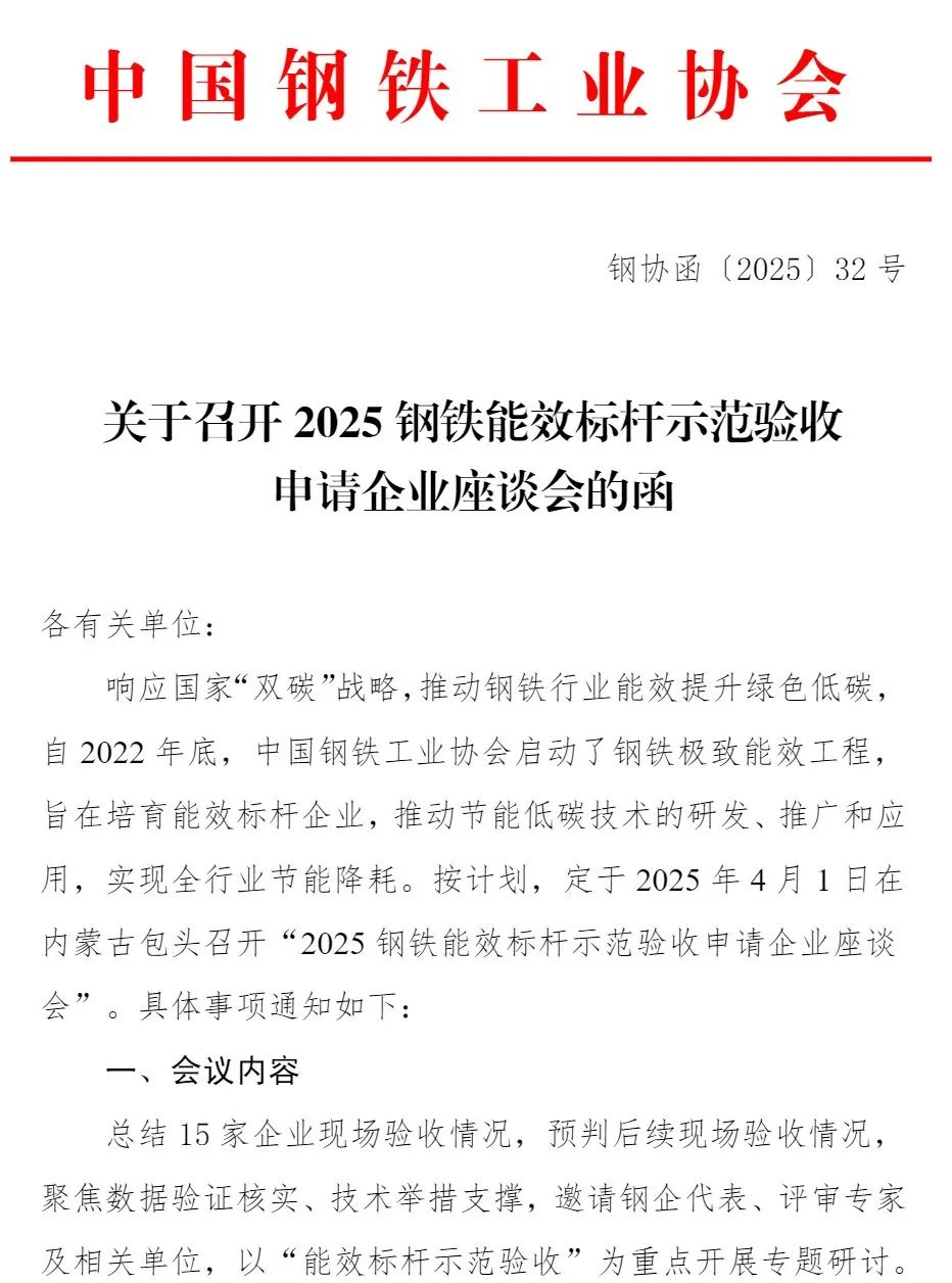 關于召開2025鋼鐵能效標桿示范驗收申請企業座談會的函