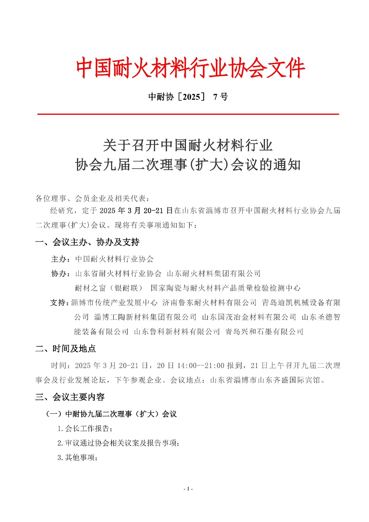 關(guān)于召開中國耐火材料行業(yè)協(xié)會九屆二次理事(擴大)會議的通知