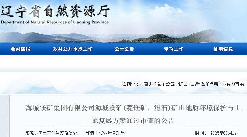 根據(jù)《國土資源部辦公廳關(guān)于做好礦山地質(zhì)環(huán)境保護(hù)與土地復(fù)墾方案編報(bào)有關(guān)工作的通知》(國土資規(guī)〔2016〕21號)和《關(guān)于印發(fā)礦山地質(zhì)環(huán)境保護(hù)與土地復(fù)墾方案省級審查管理辦法(試行)的通知》(遼自然資發(fā)〔2022〕129號)有關(guān)要求,海城鎂礦集團(tuán)有限公司海城鎂礦(菱鎂礦、滑石)礦山地質(zhì)環(huán)境保護(hù)與土地復(fù)墾方案通過審查,現(xiàn)予公告。