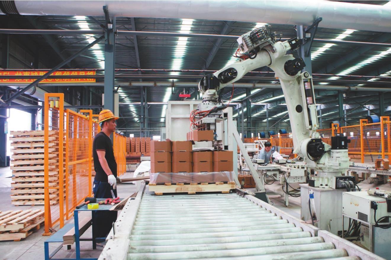 后英集團海城市勝輝耐火材料制造有限公司生產車間里,機械臂抓取耐火磚。