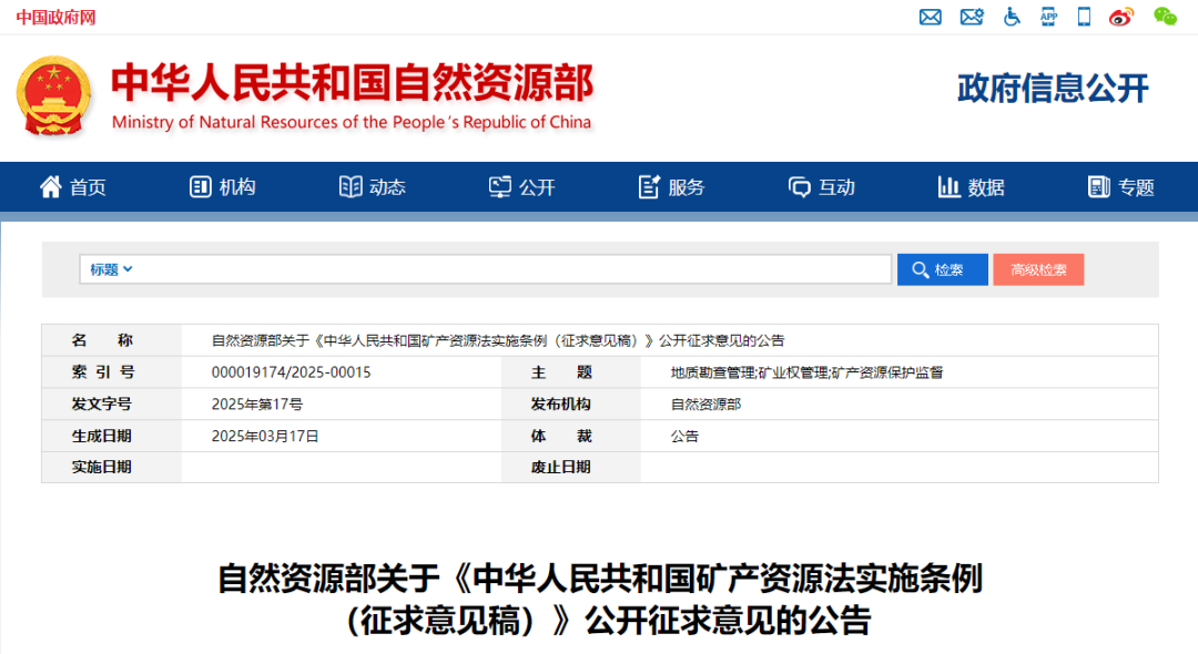 為貫徹落實(shí)黨中央、國(guó)務(wù)院關(guān)于深化礦產(chǎn)資源管理制度改革的決策部署,進(jìn)一步健全完善以《礦產(chǎn)資源法》為核心的礦產(chǎn)資源法律法規(guī)體系,自然資源部起草了《中華人民共和國(guó)礦產(chǎn)資源法實(shí)施條例(征求意見稿)》。為了增強(qiáng)立法的公開性和透明度,提高立法質(zhì)量,現(xiàn)將《中華人民共和國(guó)礦產(chǎn)資源法實(shí)施條例(征求意見稿)》及其說明公布,征求社會(huì)各界意見。公眾可以登錄自然資源部門戶網(wǎng)站(http://www.mnr.gov.cn)查閱征求意見稿及其說明。有關(guān)意見建議可以在2025年4月15日前通過電子郵件方式發(fā)送至:fgzqyj@mail.mnr.gov.cn。