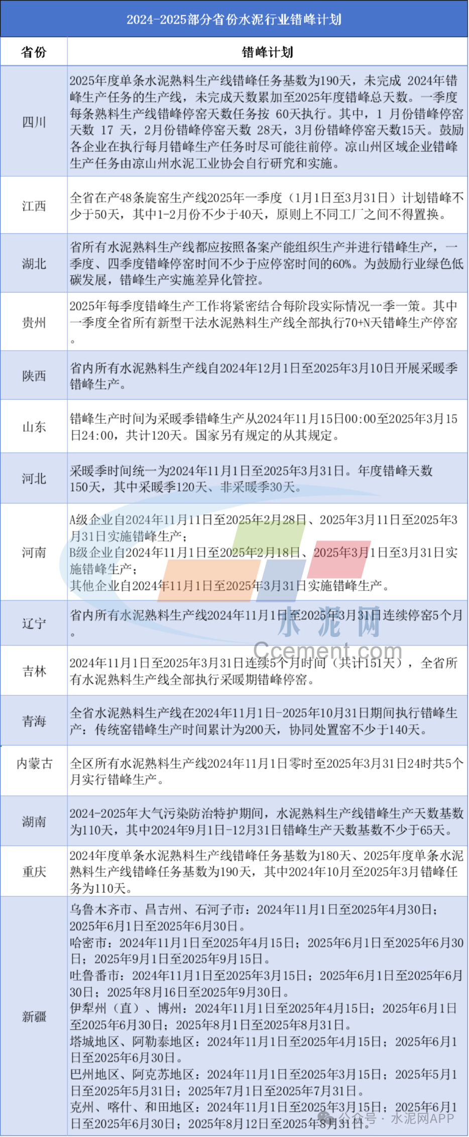 此外,塔牌表示,2025年廣西每條生產(chǎn)線平均全年錯(cuò)峰160天,福建預(yù)計(jì)全年錯(cuò)峰170天。2025年部分省份水泥企業(yè)錯(cuò)峰計(jì)劃匯總見下表: