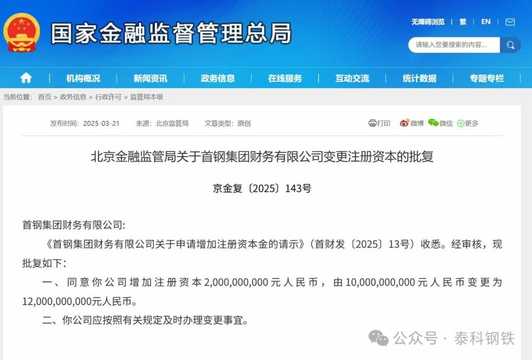 3月21日,北京金融監(jiān)管局公布相關(guān)批復(fù),同意首鋼集團(tuán)財(cái)務(wù)有限公司(簡(jiǎn)稱“首鋼集團(tuán)財(cái)務(wù)公司”)增加注冊(cè)資本20億元(2,000,000,000元)人民幣,由100億元(10,000,000,000元)人民幣變更為120億元(12,000,000,000元)人民幣。以下是相關(guān)批復(fù)正文: