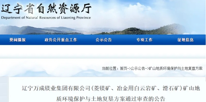 根據《國土資源部辦公廳關于做好礦山地質環境保護與土地復墾方案編報有關工作的通知》(國土資規〔2016〕21號)和《關于印發礦山地質環境保護與土地復墾方案省級審查管理辦法(試行)的通知》(遼自然資發〔2022〕129號)有關要求,遼寧萬成鎂業集團有限公司(菱鎂礦、冶金用白云巖礦、滑石礦)礦山地質環境保護與土地復墾方案通過審查,現予公告。