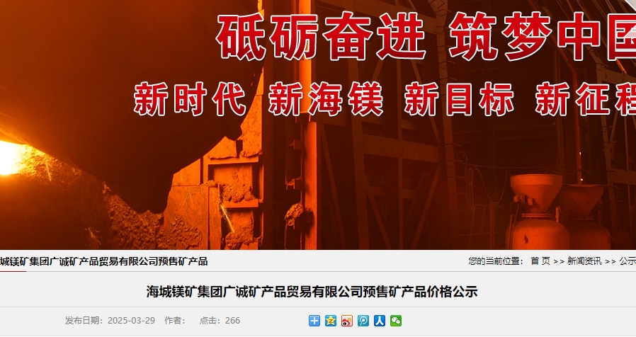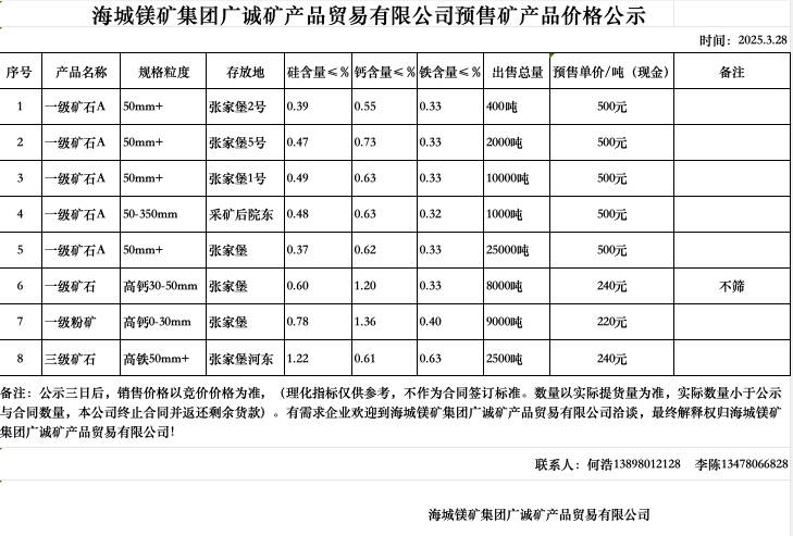 海城鎂礦集團(tuán)廣誠礦產(chǎn)品貿(mào)易有限公司預(yù)售礦產(chǎn)品價格公示