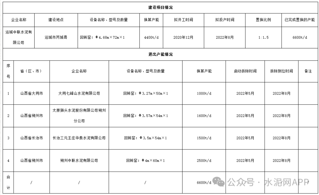 據了解,2020年9月,山西工信廳發布《運城中聯水泥有限公司建設項目產能置換方案公告》,運城中聯水泥擬建4400t/d水泥熟料線。置換方案如下: