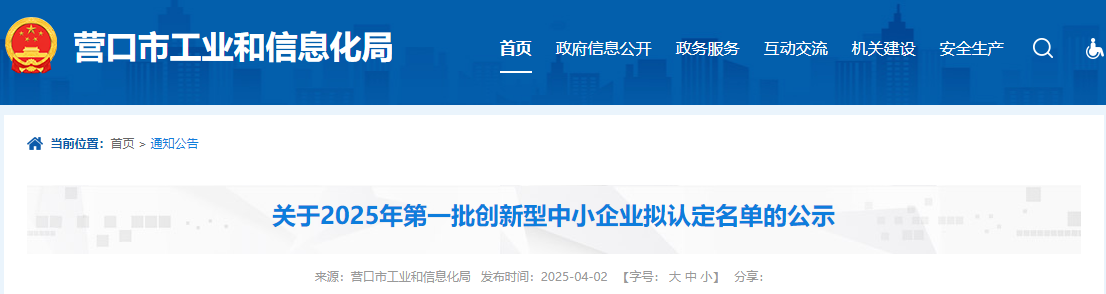 按省工信廳《關于做好2025年度創新型中小企業申報工作的通知》要求,經企業登錄優質中小企業梯度培育平臺自愿申報,各縣(市)區、園區工信主管部門推薦,市工信局初審,擬認定營口盛和耐材制造有限公司等10家企業為2025年第一批創新型中小企業,現將通過名單予以公示。任何單位或個人對公示有異議的,可在公示期內與市工信局聯系。