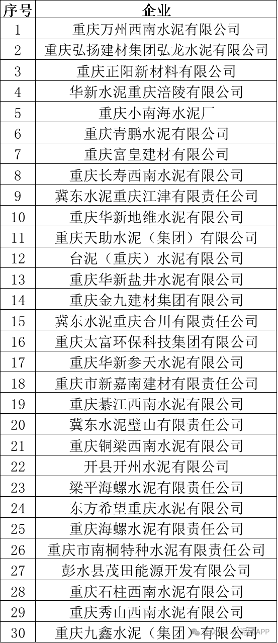 根據(jù)公布的名單,30家水泥企業(yè)納入《2024年度重慶市納入全國碳排放權交易市場發(fā)電外其他行業(yè)重點排放單位名錄》。