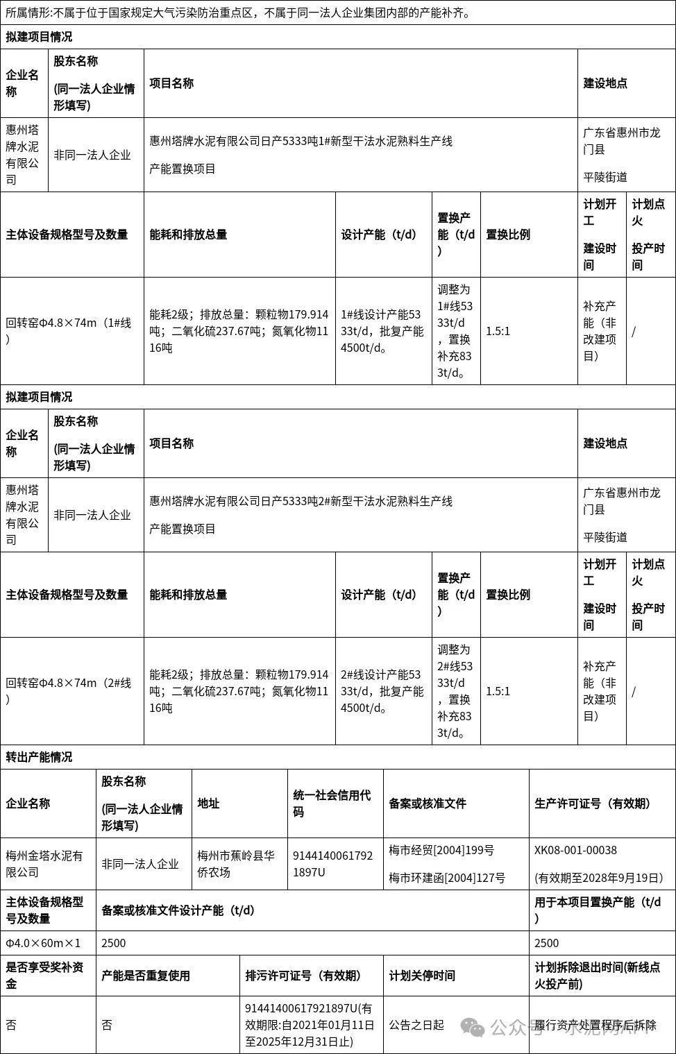 置換方案顯示,惠州塔牌水泥兩條4500t/d熟料生產線各置換補充產能833t/d,補充后兩條生產線產能均為5333t/d。退出產能為梅州金塔水泥公司2500t/d熟料生產線,置換比例1.5:1。