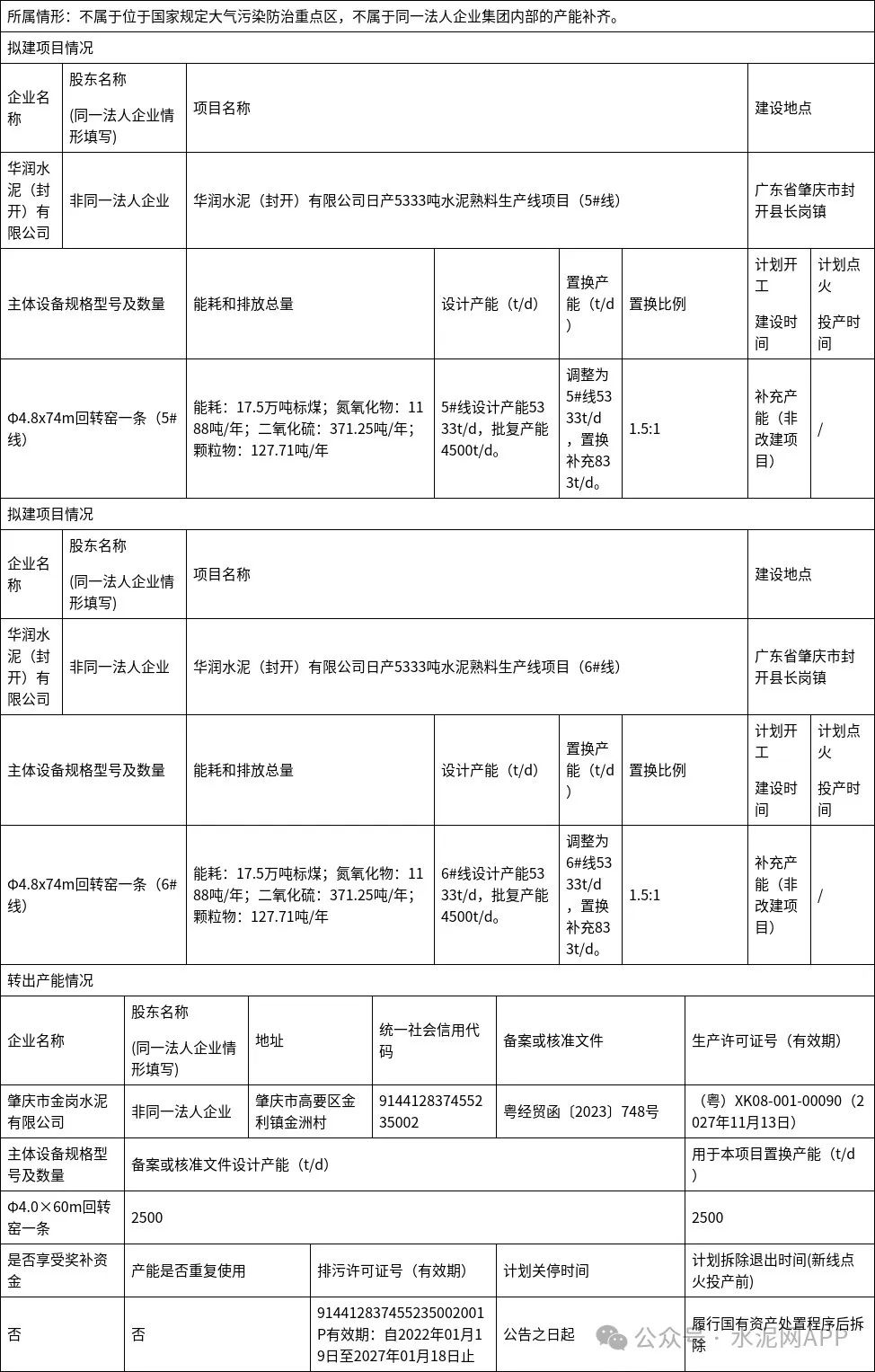 華潤水泥(封開)有限公司兩條4500t/d熟料生產線各置換補充產能833t/d,補充后兩條生產線產能均為5333t/d。退出產能為肇慶市金崗水泥2500t/d熟料生產線,置換比例1.5:1。