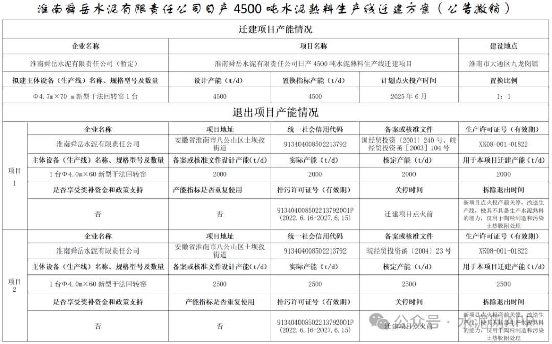 2023年3月,原安徽省經濟和信息化廳(現安徽省工業和信息化廳)對淮南舜岳水泥有限責任公司日產4500噸水泥熟料生產線遷建方案進行公告(皖經信公告〔2023〕8號)。后因市場預期和政策變化,項目未開工建設。根據《水泥玻璃行業產能置換實施辦法(2024年本)》,經淮南舜岳水泥有限責任公司申請,淮南市工業和信息化局審核、公示后上報,現將上述項目生產線遷建方案予以撤銷。