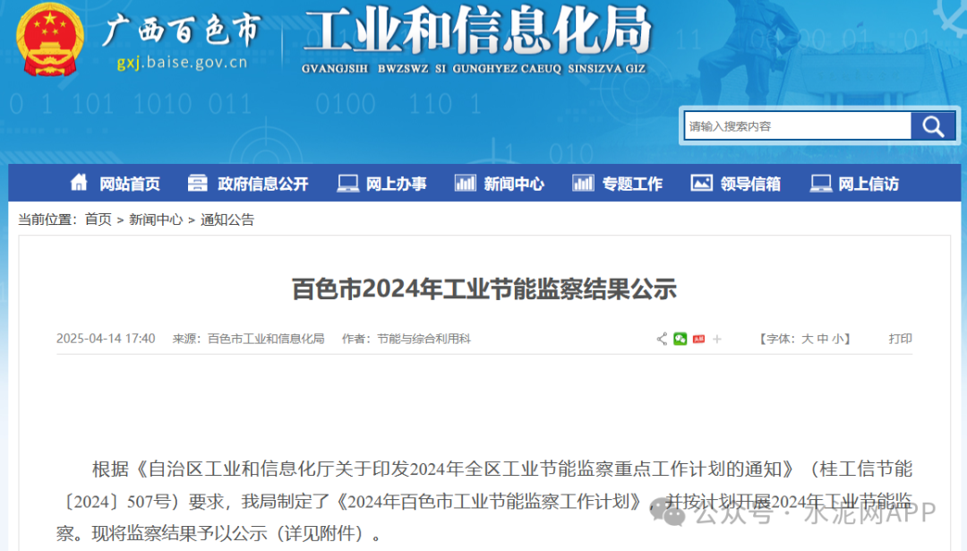 4月14日,廣西百色市工信局發布2024年工業節能監察結果公示。