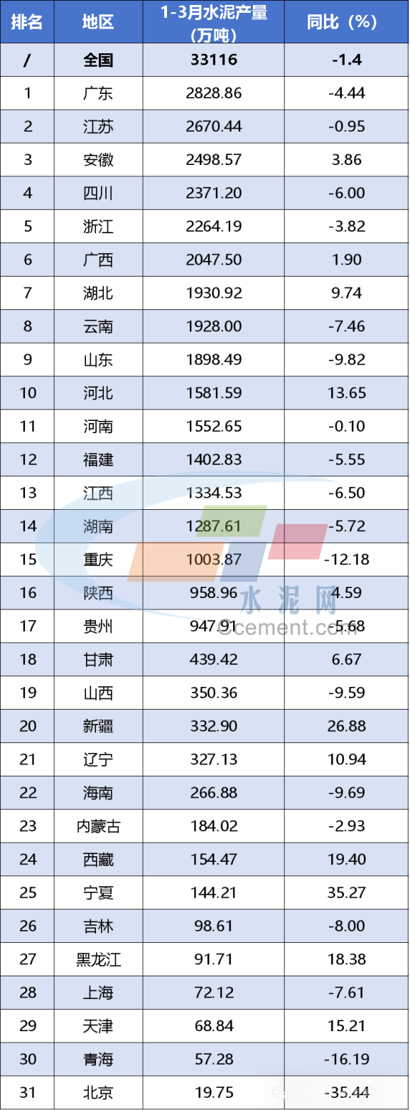 國家統計局數據顯示,2025年3月水泥產量為1.58億噸,同比增長2.5%;2025年1-3月水泥產量為3.31億噸,同比下降1.4%。