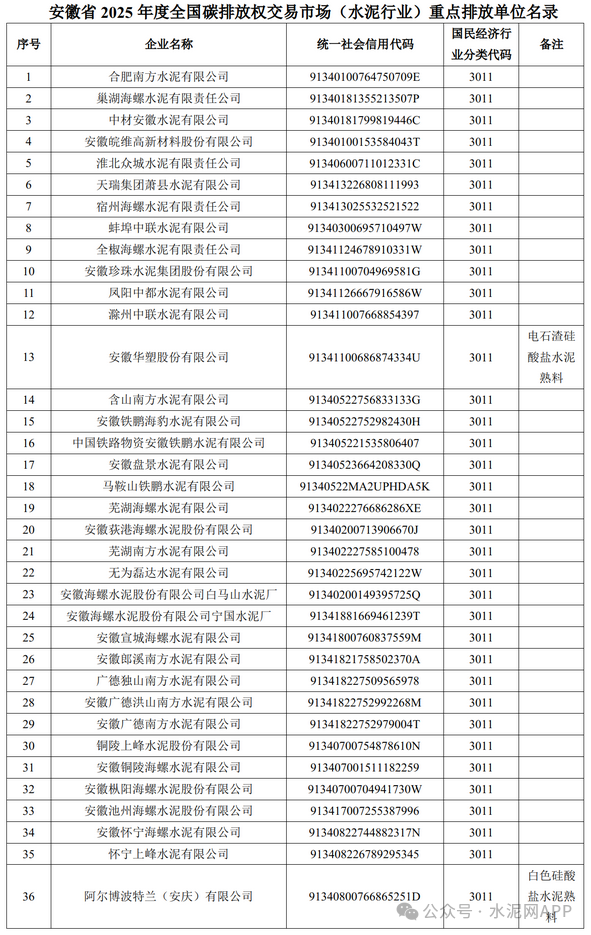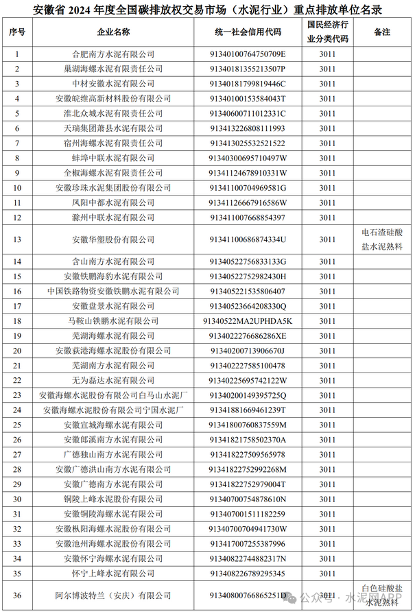 4月23日,安徽省生態(tài)環(huán)境廳發(fā)布“2024年度和2025年度全國碳排放權交易市場水泥行業(yè)重點排放單位名錄公示”。