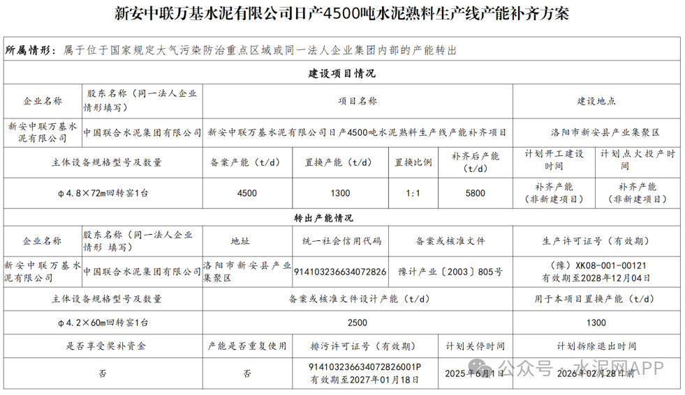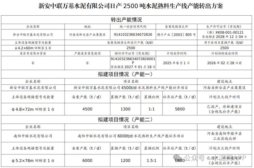 內(nèi)容顯示,新安中聯(lián)萬基水泥4500t/d熟料生產(chǎn)線置換補充產(chǎn)能1300t/d,補充后產(chǎn)能為5800t/d,出讓產(chǎn)能來自同公司2500t/d熟料生產(chǎn)線,用于本產(chǎn)能1300t/d,置換比例1:1;剩余1200t/d熟料產(chǎn)能用于補充南陽中聯(lián)6000t/d熟料生產(chǎn)線,補充后南陽中聯(lián)生產(chǎn)線產(chǎn)能達到6800t/d,置換比例1.5:1。