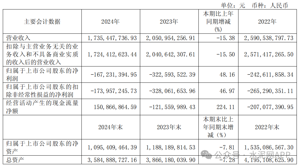 4月21日,福建水泥公布2024年年報(bào),公司營業(yè)收入為17.4億元,同比下降15.4%;歸屬于上市公司股東的凈利潤-1.67億元,去年同期虧損3.23億元。