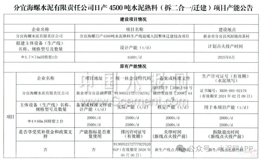 據了解,2023年11月,江西工信廳發布“關于分宜海螺水泥有限責任公司日產4500噸水泥熟料項目產能的公告”稱,分宜海螺水泥擬實施水泥熟料生產線退城入園整體遷建技改項目,將建一條4500t/d熟料生產線,退出公司原有的一條2500t/d及一條2000t/d熟料生產線。
