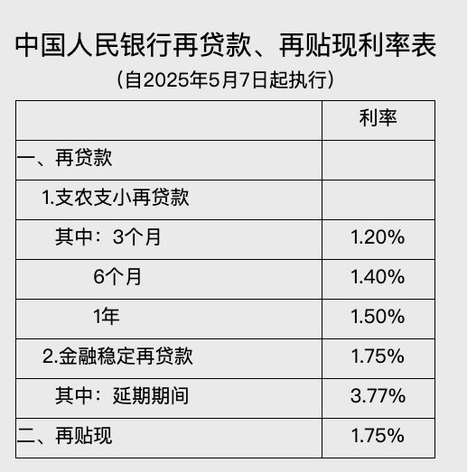 央視網消息:5月7日,中國人民銀行公布再貸款、再貼現利率表:3個月、6個月和1年期支農支小再貸款利率分別為1.2%、1.4%和1.5%,金融穩定再貸款利率為1.75%,其中延期期間為3.77%,再貼現利率為1.75%。