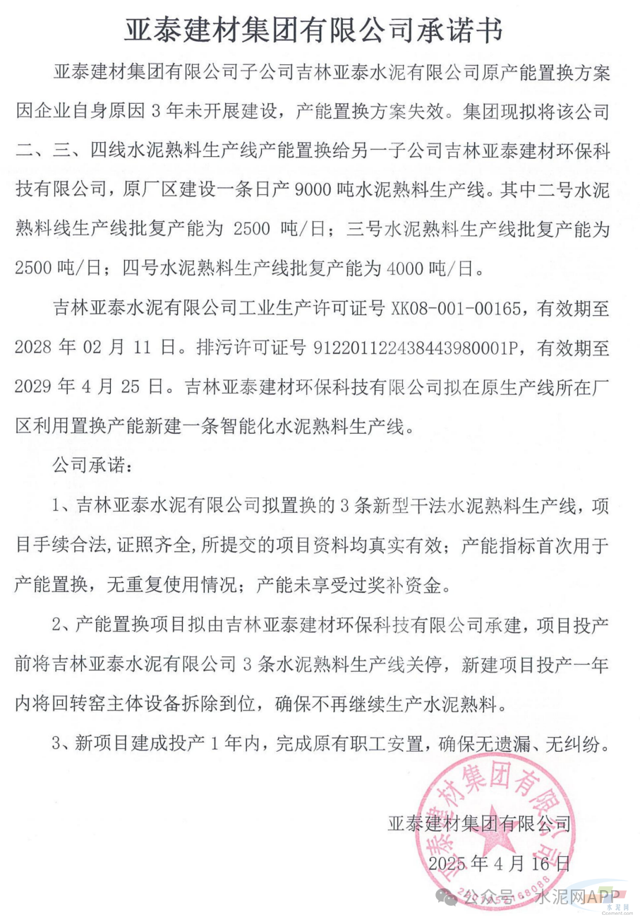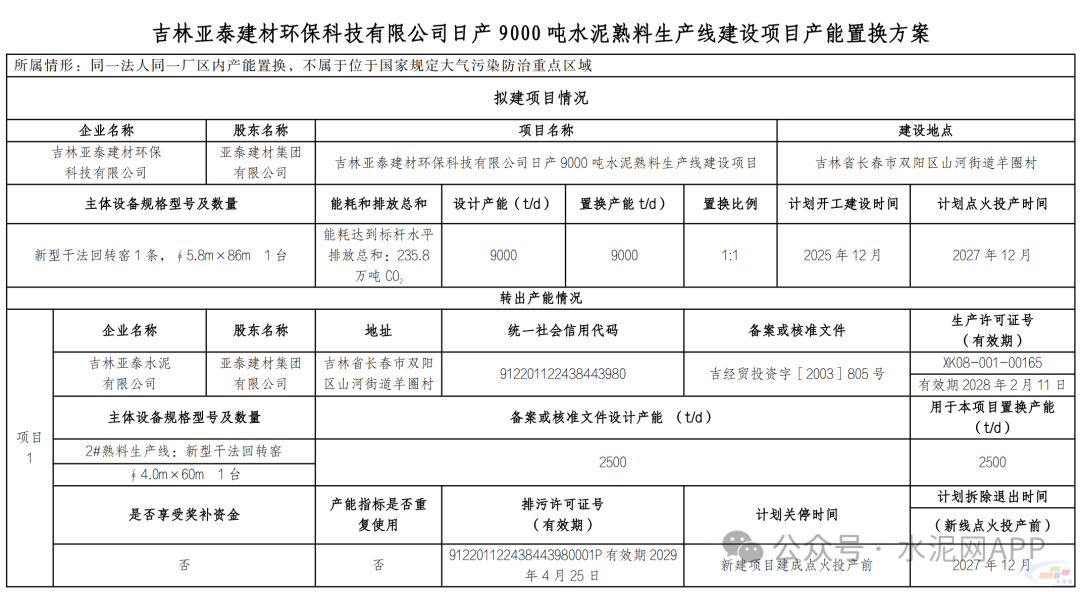 4月30日,吉林省工信廳發布《關于對亞泰建材環??萍加邢薰救债a9000噸水泥熟料建設項目產能置換方案的公示》?!豆尽凤@示,吉林亞泰建材環??萍加邢薰緦?:1等量置換建設一條9000t/d熟料生產線。