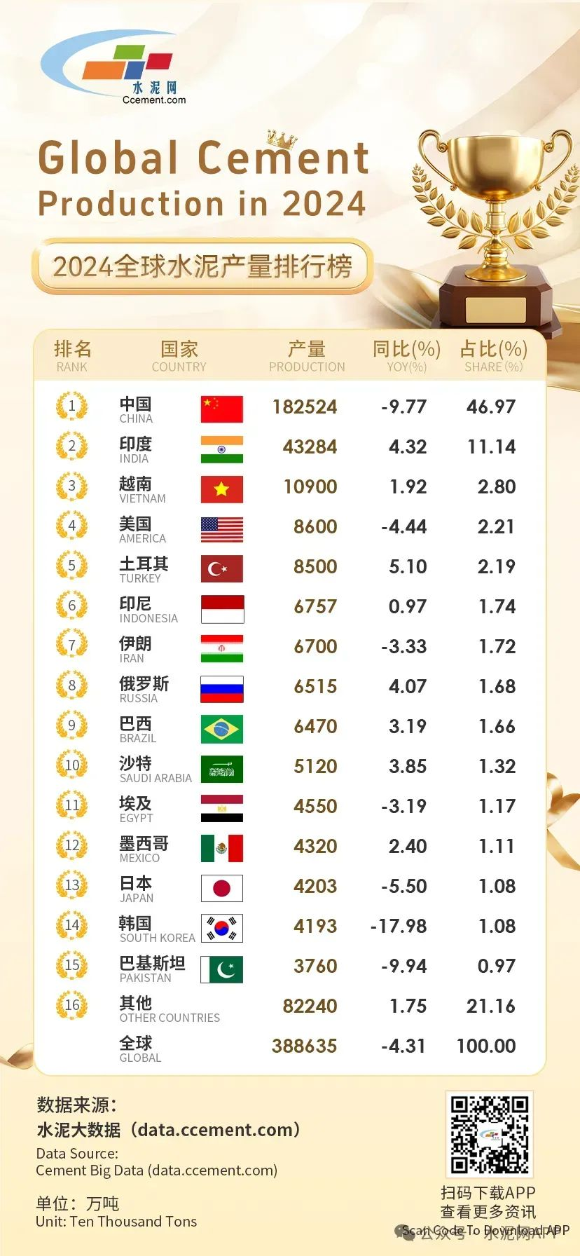 根據榜單顯示,2024年全球水泥產量38.86億噸,同比下降4.31%;中國以18.25億噸的水泥產量,自1985年以來,連續39年位居第一。